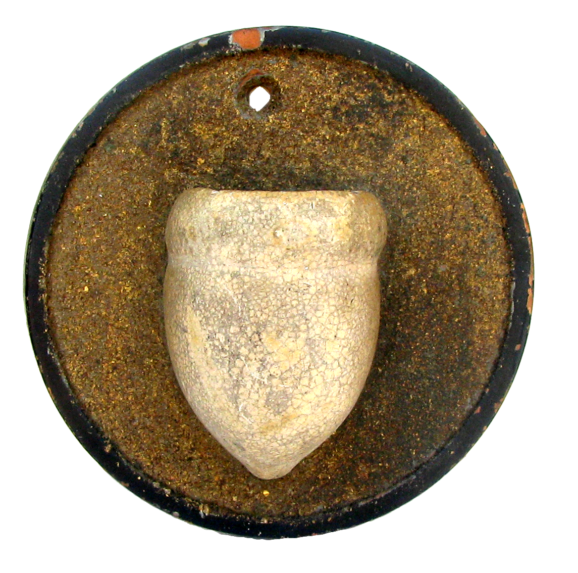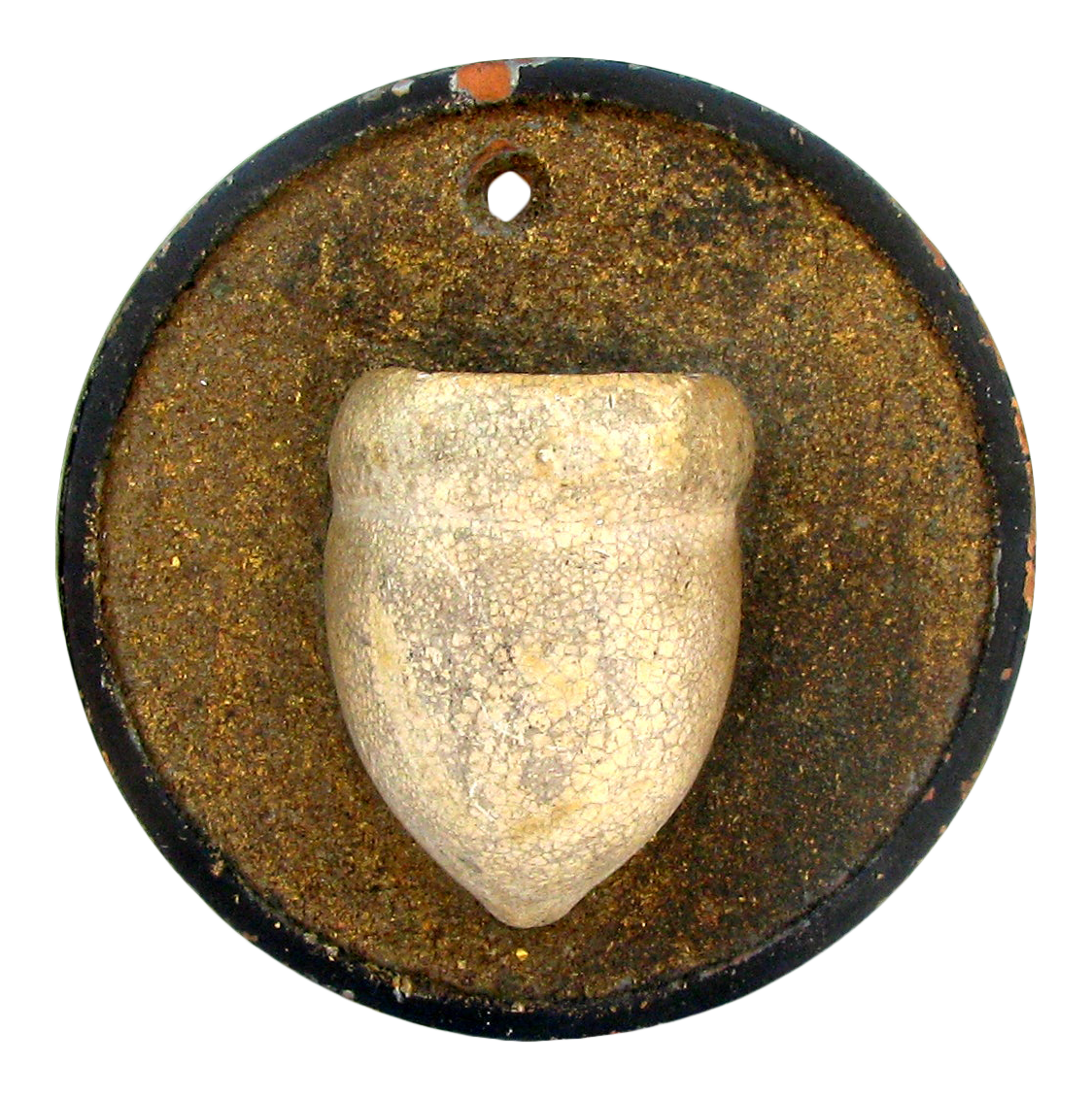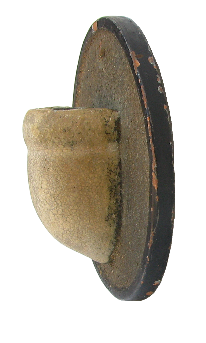 Good antique condition; glaze chips on the rim (as shown) and near the hanging hole on the back (as shown). We believe the front chips could be easily hidden by infilling with matte black paint, but we leave it to the buyer whether to do so or not.